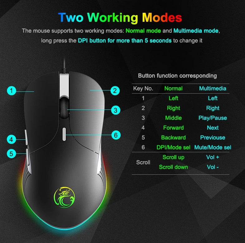 The IMICE X6 Wired RGB Gaming Mouse includes six fully customisable keys. As a result, you can personalise your commands for quick access during battles or everyday computer tasks. In addition, the optical sensor supports six adjustable DPI levels. This flexibility allows you to switch between high precision targeting and rapid cursor movement with ease.